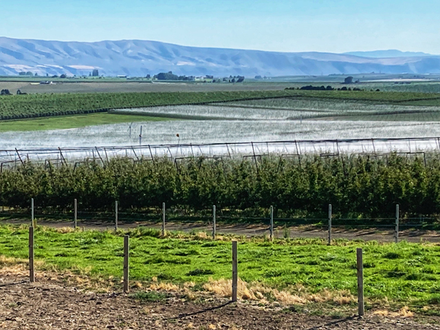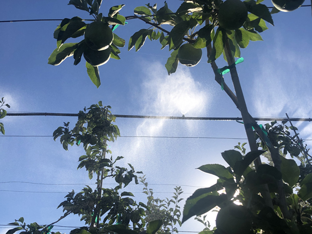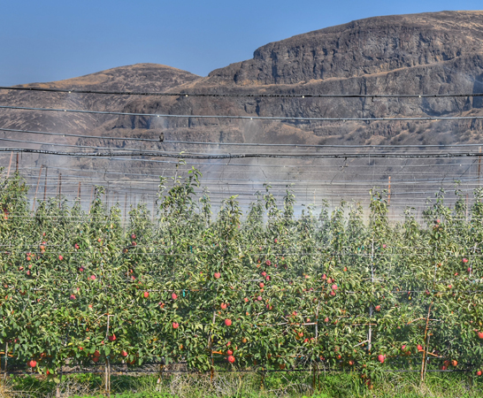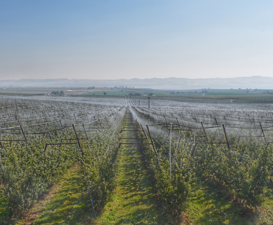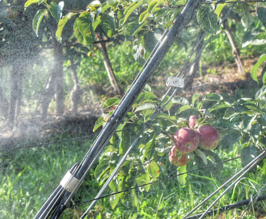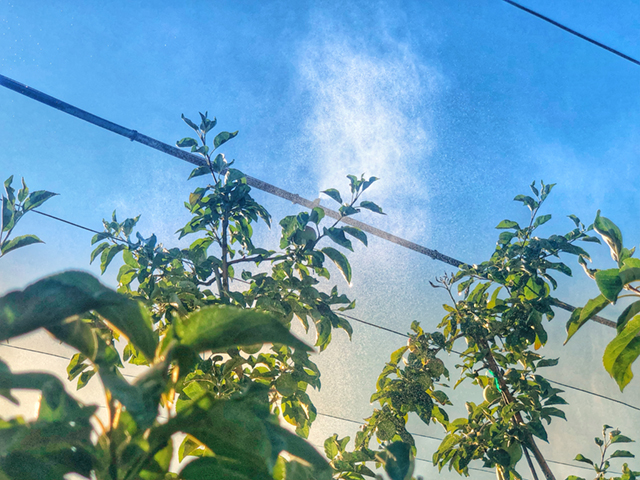 EXL foggers emit very fine droplets at lower flow rates, creating a blanket misting coverage design over an orchard canopy. At 18 to 20 GPM (68 to 91 LPM) per acre, this very effective cooling system also lowers light transmission. With a close spacing layout, a blanket of fog envelops the orchard to decrease temperature and light transmission. The decrease in temperature is from evaporation of water from the air, followed by removal of the water vapor deposit on fruit skin surface by air movement, leading to overall lower temperatures and a better yield.