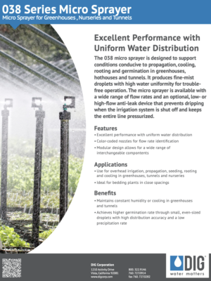 Designed for use in greenhouses, DIG’s 52-038-xx micro sprayers produce fine droplets and come in a wide range of flow rates. They are ideal for maintaining conditions conducive to propagation and germination. An optional anti-leak device prevents dripping at the beginning and the end of each irrigation cycle, keeping the entire line pressurized.
