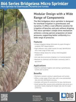 DIG’s mini-compact 866 series micro sprinklers offer high uniformity and efficient overhead irrigation in an inverted position for greenhouses. They can operate with an anti-leak device to prevent dripping at the beginning and at the end of each irrigation cycle, keeping the entire line pressurized. The micro sprinklers use interchangeable components with eight different nozzles and are suitable for applications in the irrigation of seedlings, young saplings and mature trees.