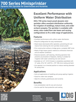 DIG’s 700 series insect-proof, dynamic mini sprinklers offer excellent distribution uniformity for irrigation of seedlings, mature trees, and under-canopy irrigation of saplings for greenhouses and nurseries. The press-fit base mini sprinklers are available in seven flow rates with color-coded bases, and varying configurations to fit a wide range of applications.
