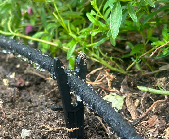 - Lay out 1/2″ drip tubing per your drawing and secure the drip tubing to the ground using stakes (model R60).