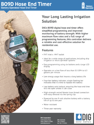 The B09D 3/4” Digital Hose End Timer, one in DIG’s newest range of hose end timers, offers simplified programming and improved monitoring of battery power with less current, resulting in longer battery life and more reliable operation. With higher flow rates at lower inlet pressures and a range of programming features, the B09D delivers a reliable and cost-effective solution for residential use. The timer has four start times per day with durations from 1 minute to 12 hours 59 minutes in an operating flow range of .5 to 6.3 gallons per minute, allowing use in a wide range of applications including drip irrigation or micro sprinkler systems connected to a garden hose or faucet/spigot. It uses one 9-volt alkaline battery that can last for over a year.
