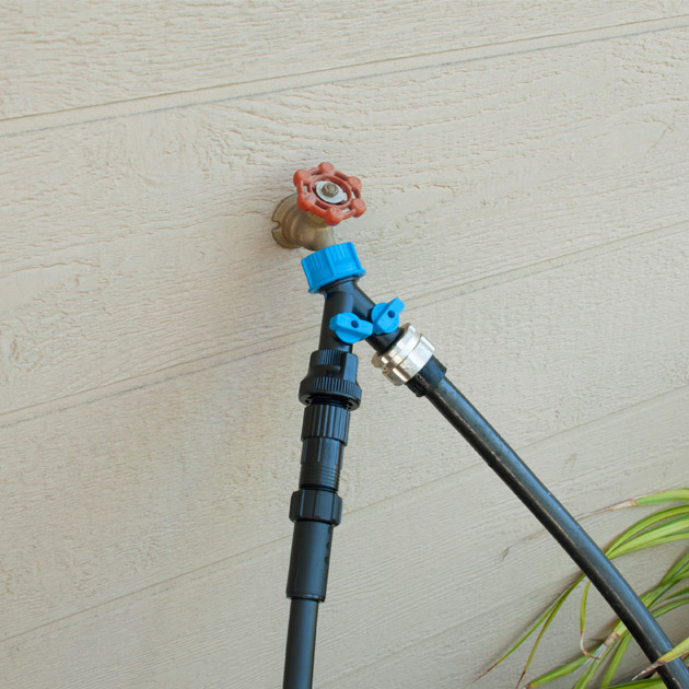 DIG’s Drip Zone Faucet Connection Kit combines all the parts needed to start a drip irrigation system from a faucet. The kit includes a ¾” two-way hose splitter, a ¾” backflow preventer, a ¾” 25-PSI pressure regulator and a 3/4″ swivel adapter with a screen to connect 1/2″ (.700 OD) poly tubing to the faucet. This kit provides a complete assembly for connecting a drip irrigation system to an outdoor faucet with an extra outlet left for your garden hose. To automate this assembly, add one of DIG’s hose end timers.