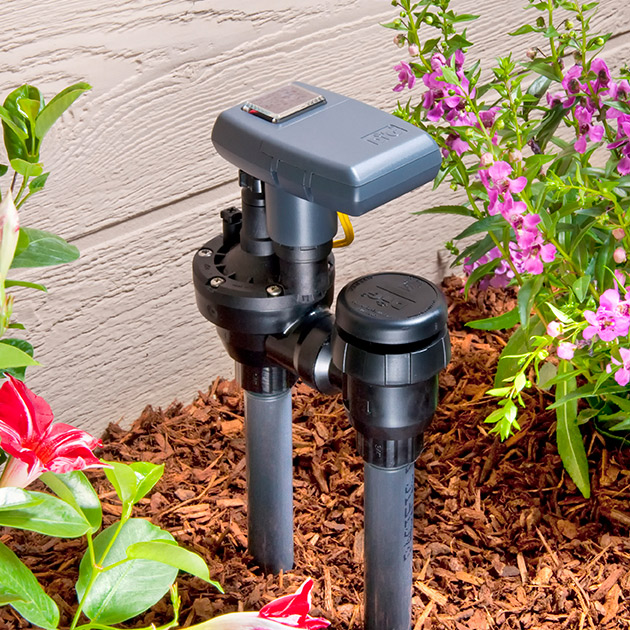 The ECO1™ ASV solar-powered irrigation controller with a 3/4″ inlet and female pipe thread outlet should be installed a minimum of 6″ above the highest sprinkler onto a 3/4″ PVC male pipe thread fitting or riser as part of your drip irrigation or sprinkler system valve manifold, or as a stand-alone unit. Make sure that the valve is installed with the flow direction arrow engraved on the side pointed away from the water source, and that the solenoid is on the outlet side of (downstream from) the valve.