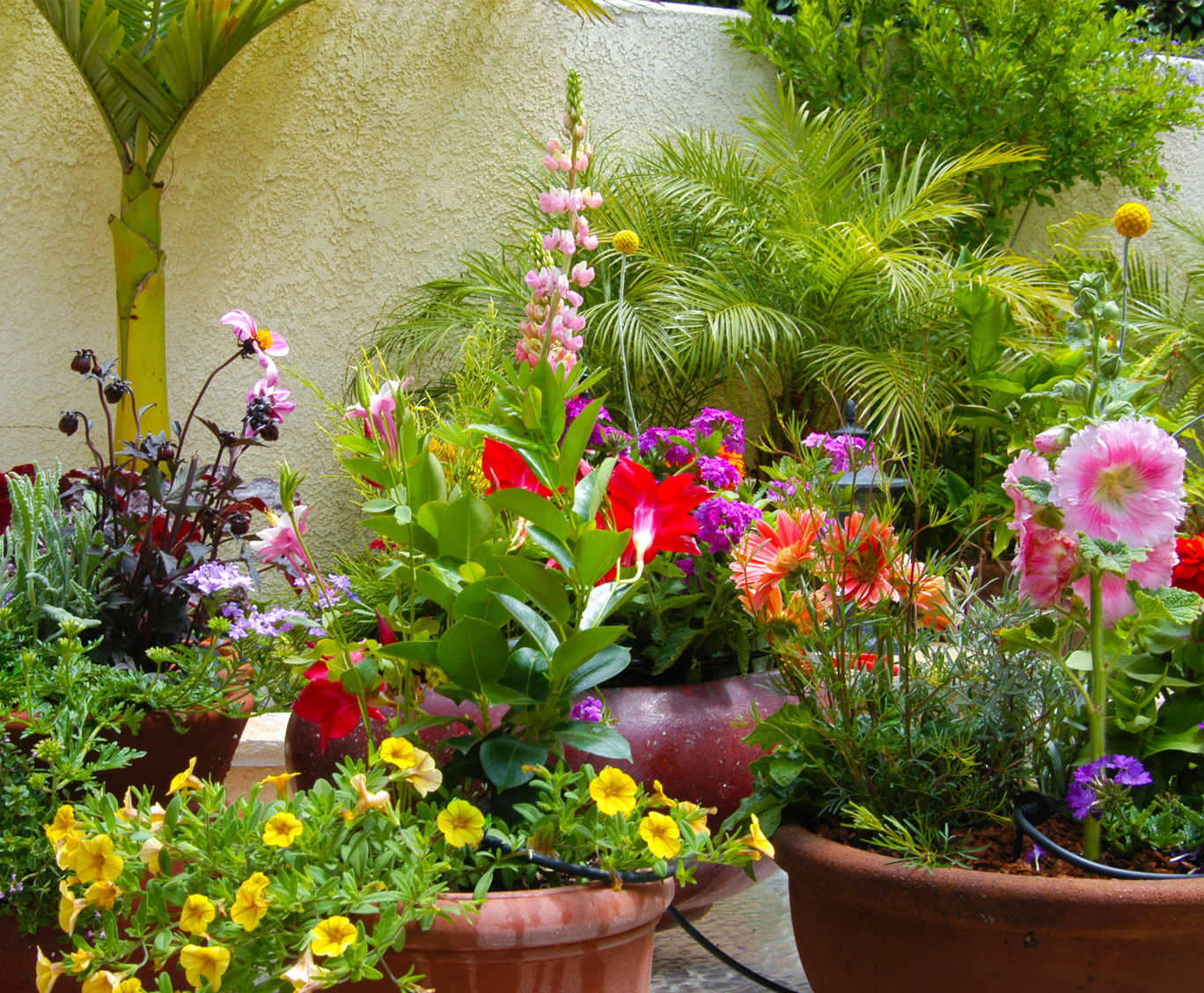 Using drip irrigation, water first thing in the morning before the temperatures begins to rise. This will allow excess moisture on leaves and top soil to dry before fungal and other diseases can develop. The most common cause of early plant death is over watering. Using drip irrigation can help sustain healthy plants by applying water directly to the plant root zone when and where it is needed. For established pot plantings, short watering times are recommended.