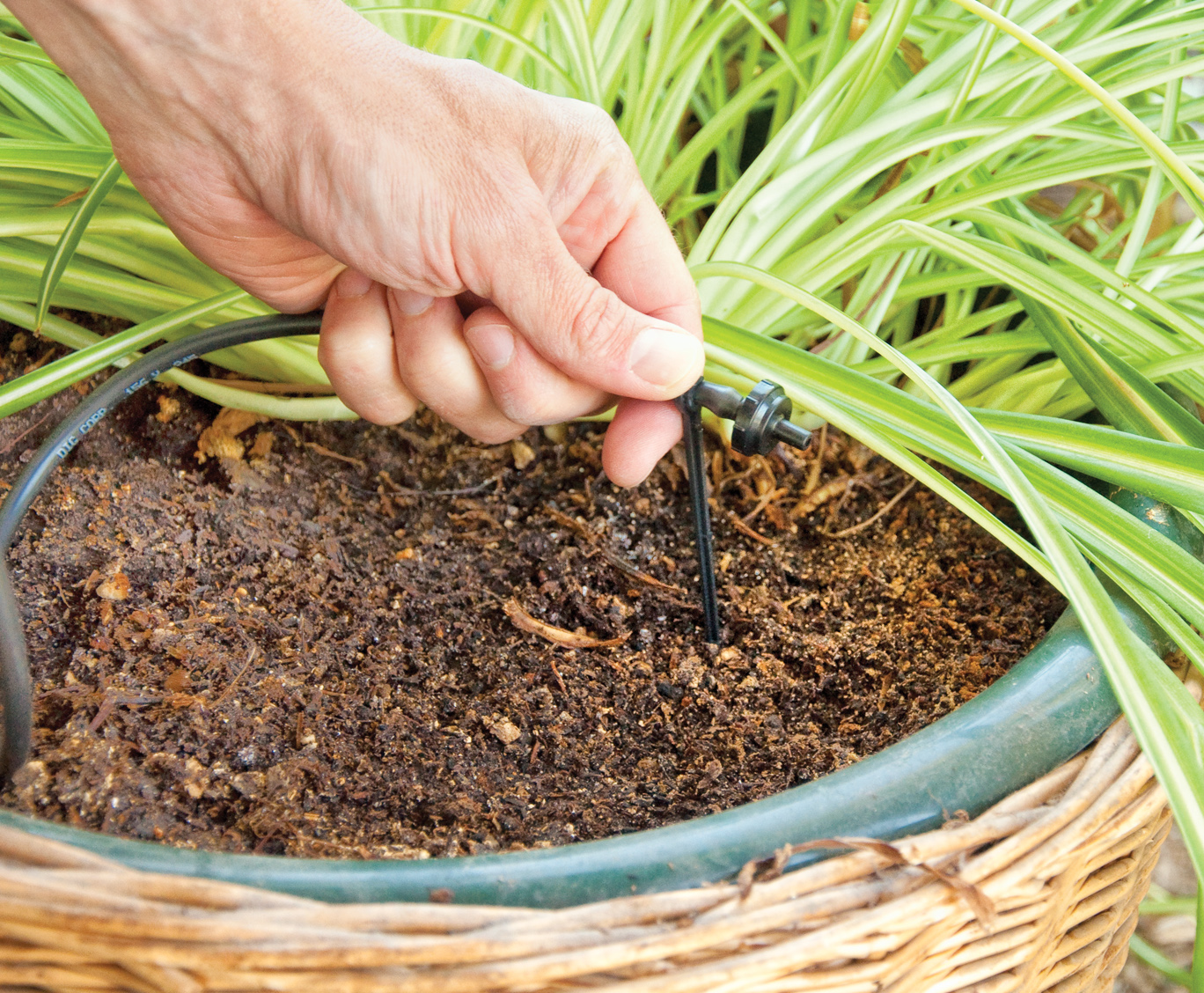 - To each end of micro tubing, insert a drip emitter and secure the drip emitter into the pot or basket with the 1/4″ stake included (model P33B).