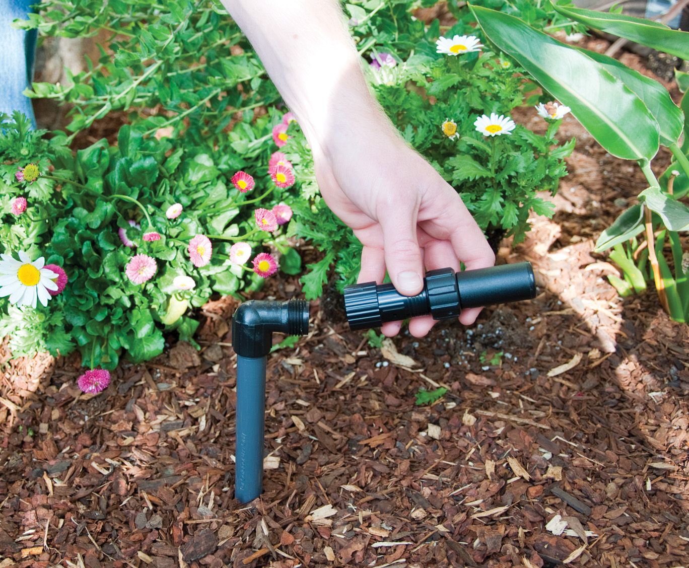 Connect the dripline to the swivel adapter by forcing the end of the dripline into the adapter’s compression side while moving it from side to side, and then lay out the dripline along the plant area.