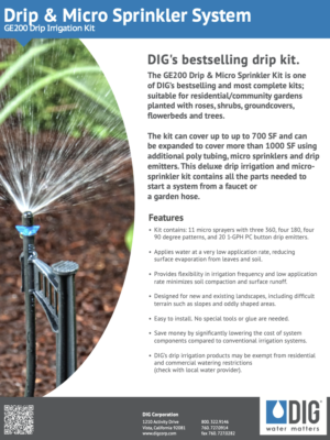 The GE200 Drip & Micro Sprinkler Kit is one of DIG’s bestselling drip irrigation kits, suitable for residential gardens planted with roses, shrubs, groundcovers, flowerbeds and trees. The kit can cover up to 700 sq. ft and can be expanded to cover more than 1000 sq. ft using additional drip tubing, micro sprayers and drip emitters. This kit contains all the parts needed to start a drip irrigation system from a faucet or a garden hose. The kit includes a 3/4″ backflow preventer, 3/4″ 25 PSI pressure regulator, 3/4″ swivel adapter, 200′ of premium 1/2″ drip tubing with .600 ID x .700 OD, 50′ of 1/4″ micro tubing, 11 micro sprayer assemblies with 13″ stakes and micro tubing with barbs, 20 1-GPH PC drip emitters and all the necessary parts needed to complete the installation.