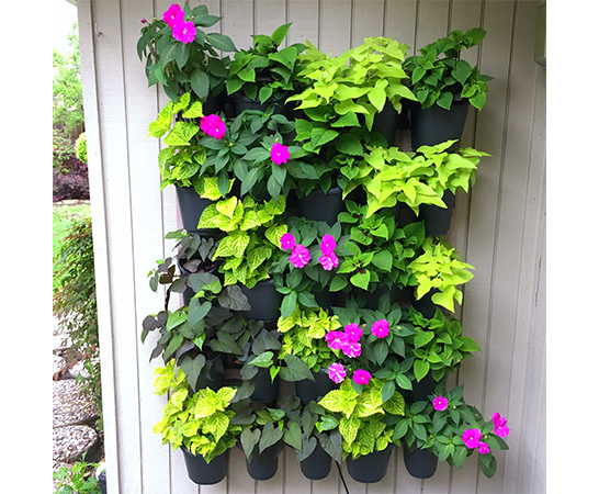 DIG’s Living Wall™ Modular Vertical Garden Kit supports an open area between the pots and the wall, providing protection from moisture and preventing discoloration of the exposed wall.