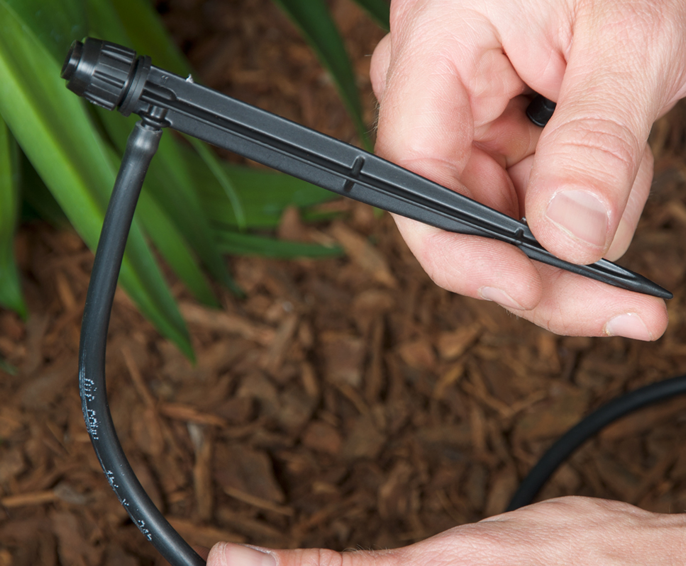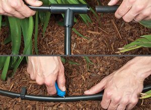 Add the tee, elbows, and other parts as needed. Punch a hole into the poly tubing and attach the micro sprayers to the 1/2″ poly tubing or to the end of the micro tubing.