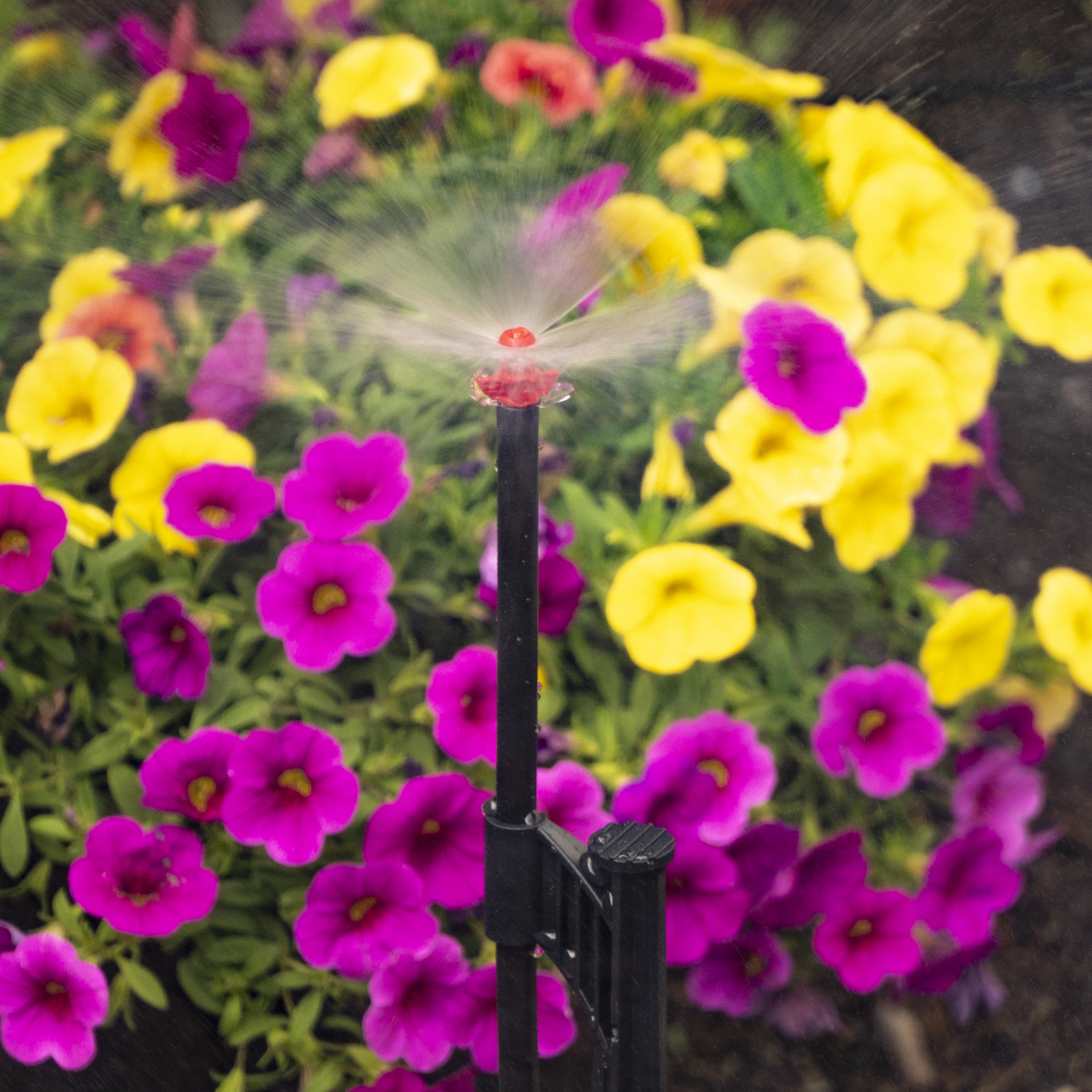 - Securely hold the micro sprayers with 1/4″ micro tubing above ground