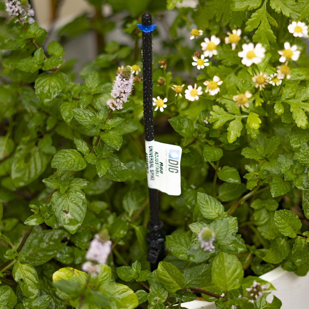 A length of 1/4″ micro tubing is attached or can be attached into the spike assembly’s barbed inlet and a micro sprinkler, mister or spray jet can be inserted at the top of the PE tubing. An additional 1/4″ barb is inserted into the other end of the micro tubing and then connected into the drip tubing.