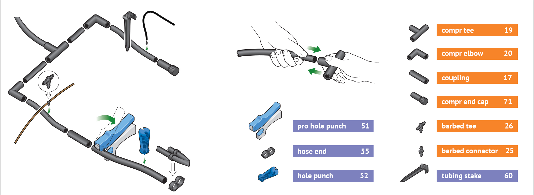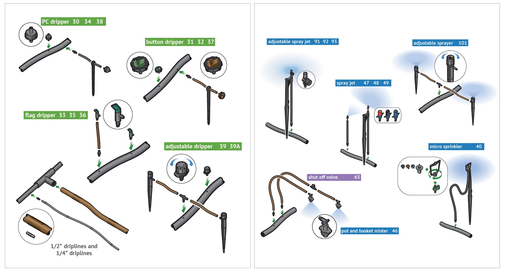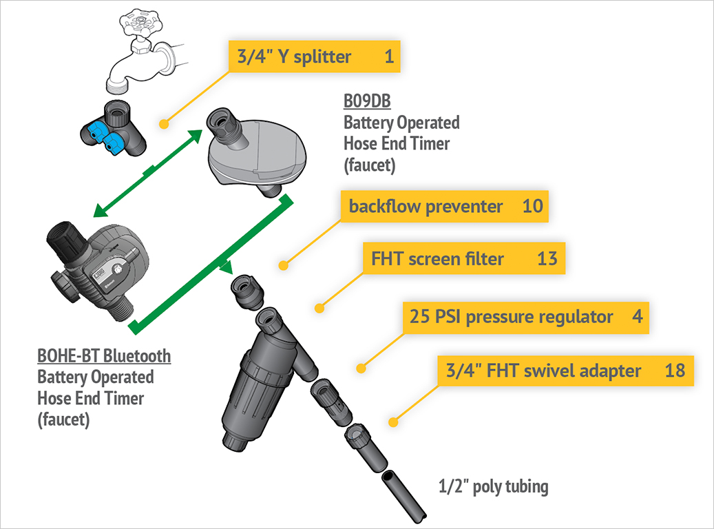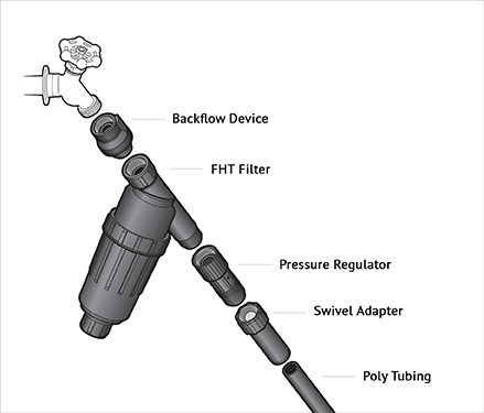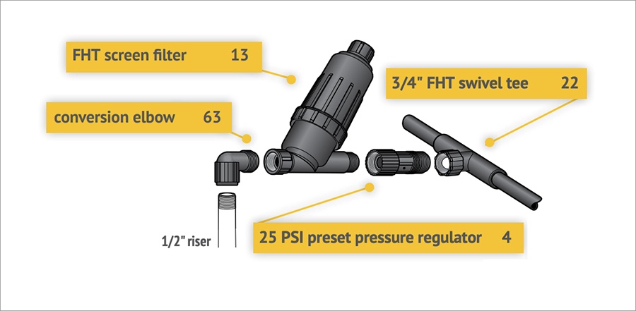 The key requirement at the point of connection is the “head assembly”, which consists of a filter and a pressure regulator. The head assembly can be attached to a hose bib (hose thread components) or connected to a valve (manual or automatic) (pipe thread components).