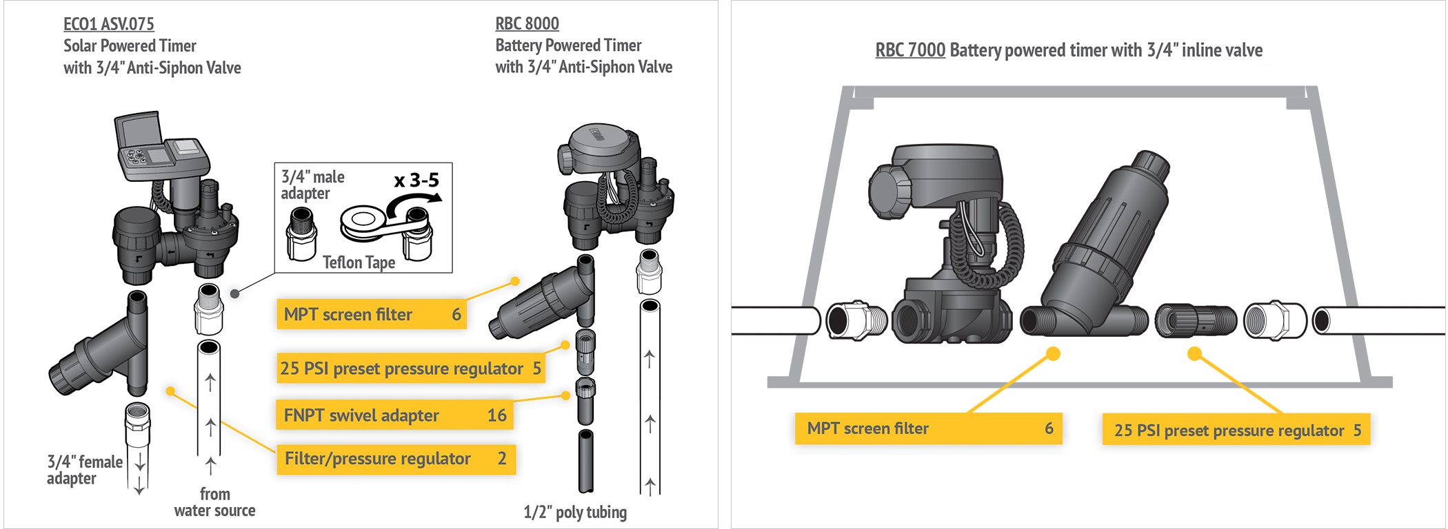 In some regions, a backflow preventer or anti-siphon device is required to meet local codes. A backflow device keeps contaminated water from re-entering the water supply and is highly recommended. A vacuum breaker (backflow preventer), when used, is installed on the hose bib (hose thread) before the head assembly. If you are planning to use a hose end timer, mount the backflow after the timer [downstream], to prevent stress on the device.