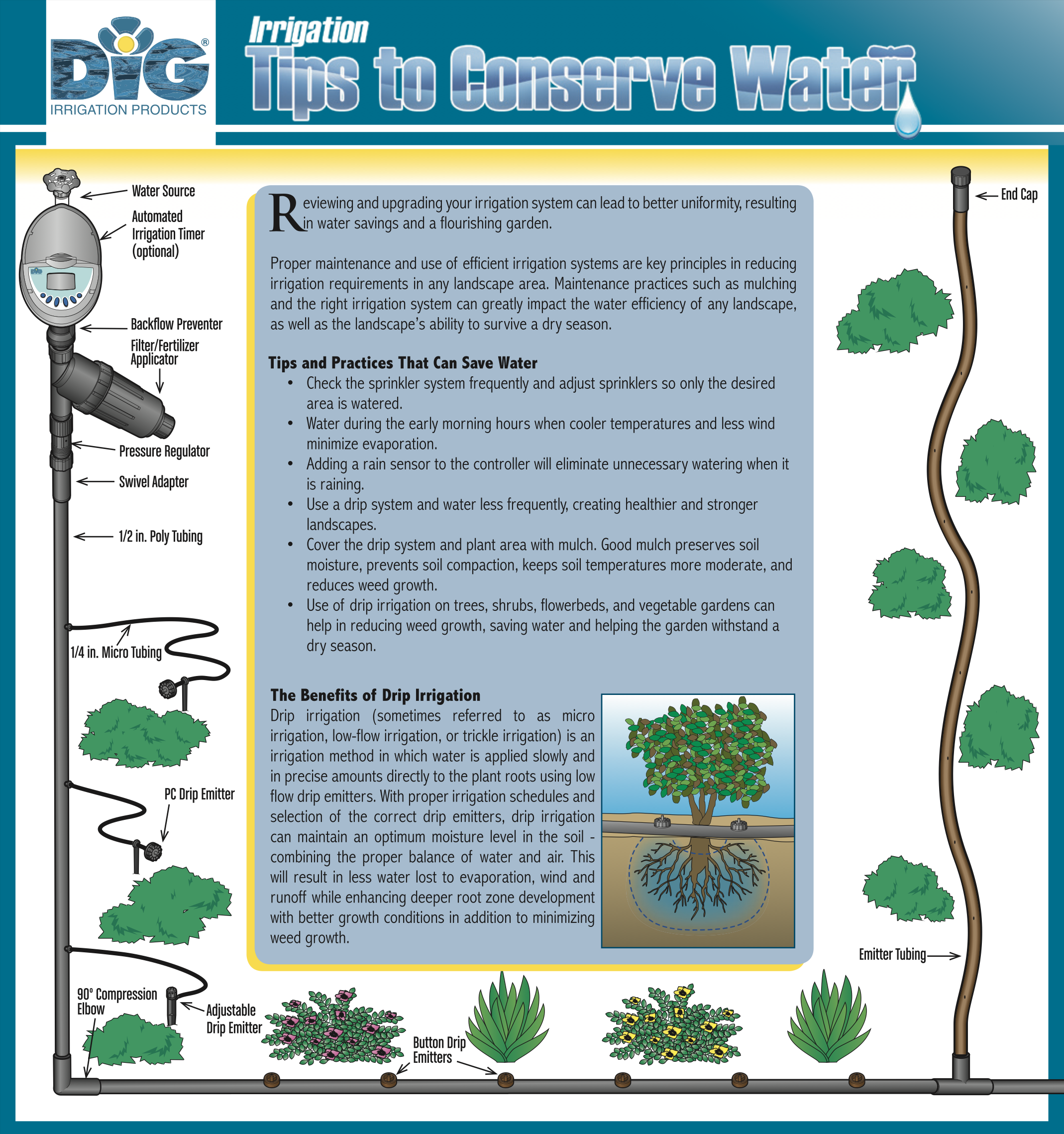 Irrigation Tips to Conserve Water Reviewing and upgrading your irrigation system can lead to better uniformity, resulting in water savings and a flourishing garden. PDF download Tags: How To