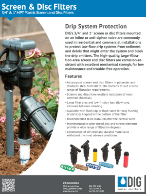 DIG’s heavy-duty plastic screen filters with hose thread are commonly used in residential and commercial installations to protect a drip irrigation system from debris that might enter the line and cause blockage of the emitters. The low maintenance, inexpensive screen filters provide reliable and trouble-free operation by removing fine sand and other particles that could otherwise block the small water passages of the drip and micro sprinklers.