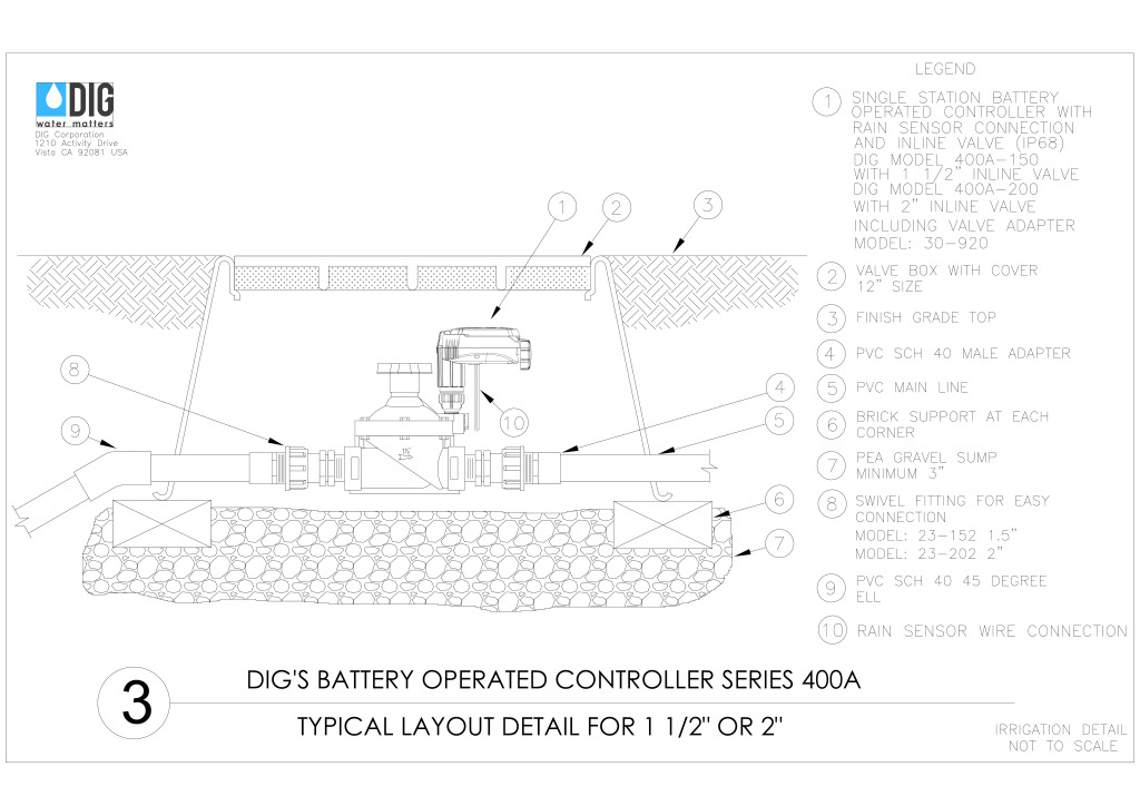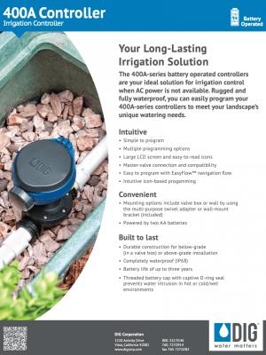 | 400A-100 | Single-Station, Battery Operated Controller with Two Wires, DC Latching Solenoid, and 1 in. Inline Valve |
