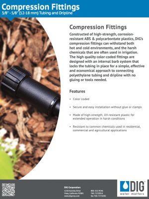 DIG’s color-coded compression fittings constructed of molded ultraviolet-resistant, high-impact plastic, DIG’s compression fittings fit a range of PE drip tubing and drip line from 1/2″ to 5/8″ in size, providing a secure, leak-proof fit across a wide range of water pressures and temperatures. With a simple wrist action, the PE drip tubing “walked” into the fittings for a very tight fit with no tools, glue, or clamps required.