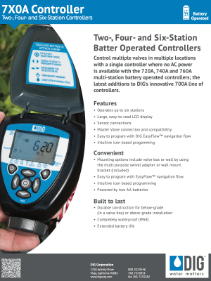 DIG’s waterproof 720A, 740A and 760A, two-, four- and six-station battery operated controllers are designed for challenging sites without AC power for above- or below-grade installation. The controllers include wire connections for a master valve, a rain sensor and up to six DC latching solenoids. Powered by two AA alkaline batteries that last for more than one season, the 7X0A series offers economical and reliable results with programming versatility and operation simplicity.
