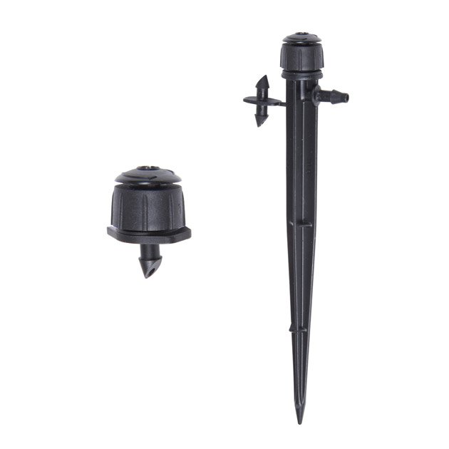 The Adjustable Bubbler on Spike is available with a full circle umbrella pattern and includes a rotating cap that allows the adjustment of flow from 0 to 32 GPH at 15 to 30 PSI, using approximately 18 clicks for full flow and diameter. The notch action between the adjustable cap and the base allows a decrease or increase of the wetting area from 0 to 3.3′. Each bubbler comes in a one-piece construction that includes a 6” spike with barb, rotating cap and an additional 1/4″ barb to connect the micro tubing to the drip tubing. Use the bubbler where overhead watering is suggested on any type of planting, including shrubs, individual trees along the poly tubing or for planter boxes and large pots.