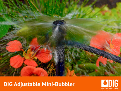 The DIG Adjustable Mini-Bubbler, boasting an umbrella pattern, is now offered with a choice of a 6 in. spike or ¼ in. barb, both featuring adjustable flow capabilities and a 360° gentle stream pattern. This versatile Mini-Bubbler delivers a flow of up to 31.5 gallons per hour (GPH) with an impressive coverage diameter of up to 3.3 feet at 30 PSI.