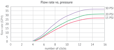 - Flow rate: 0 to 32 GPH with approximately 18 clicks