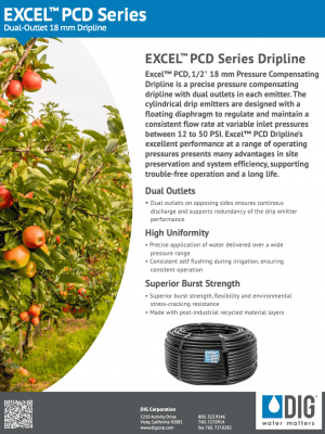 Excel™ 1/2″ PCD, Pressure Compensating, Dual Outlet Dripline is a reliable, durable and precise dripline with dual outlets per each emitter, used for narrow or dense plantings. If one drip emitter outlet becomes blocked, a second outlet on the opposing side of the emitter provides redundancy to the emitter performance. An additional benefit of the dual outlets is that it doesn’t matter which direction you lay the dripline; it will operate either way. Excel™ 1/2″ PCD drip emitters have floating diaphragms to regulate and maintain a consistent flow rate at variable inlet pressures, ranging from 12 to 50 PSI in a wide range of demanding conditions.