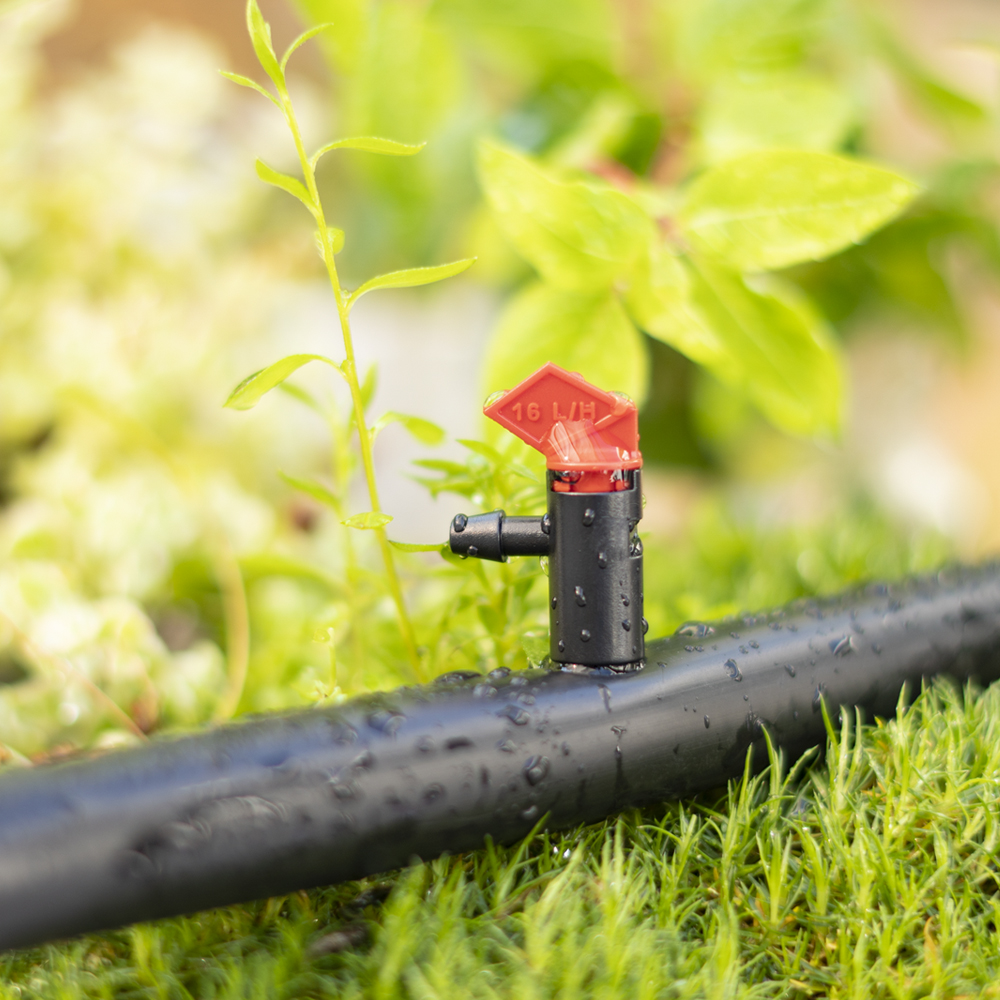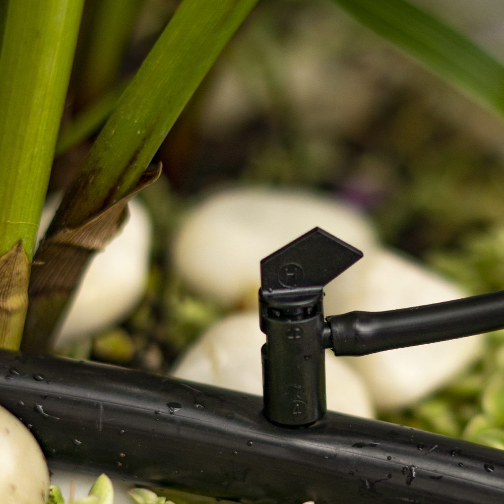 The flag drip emitters, available with flow rates of 1, 2 and 4 GPH, have a side barbed outlet for extending 1/4″ distribution tubing to the plant location. These spiral flow emitters feature a two-piece construction so that the top insert can be twisted and pulled apart for easy cleaning, and they have a recommended operating pressure of 10-20 PSI with a nominal operating pressure of 15 PSI.