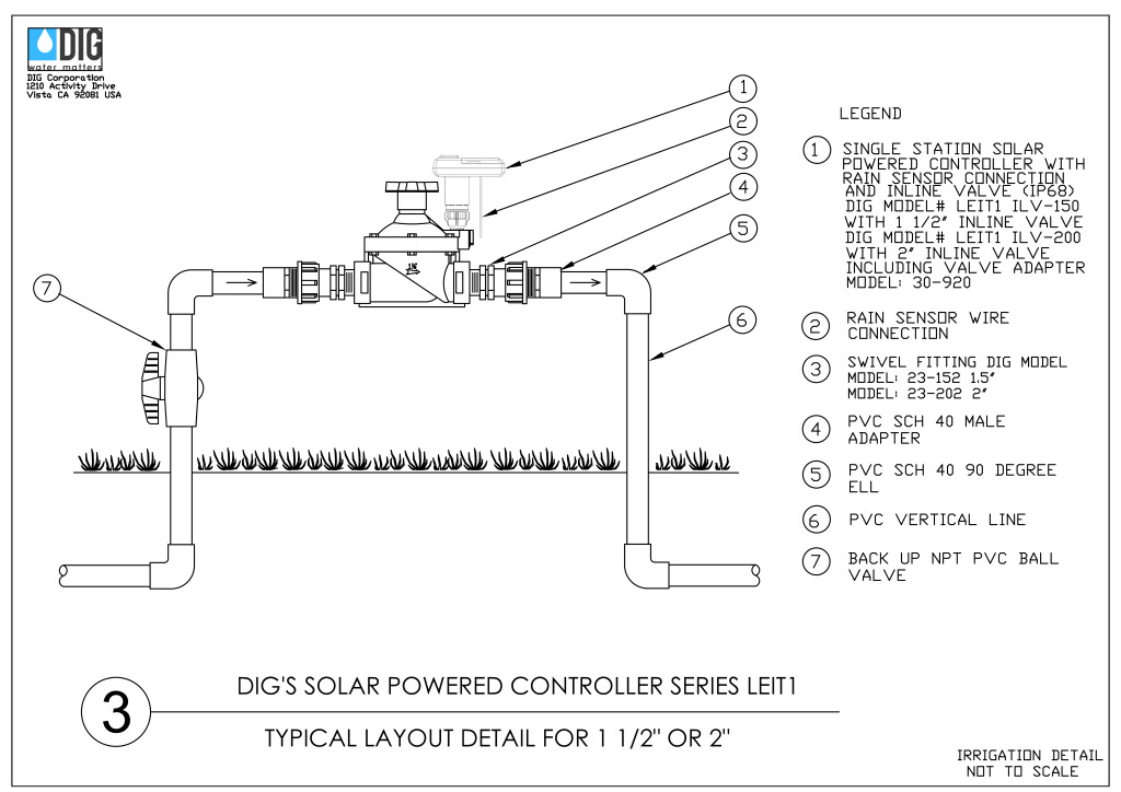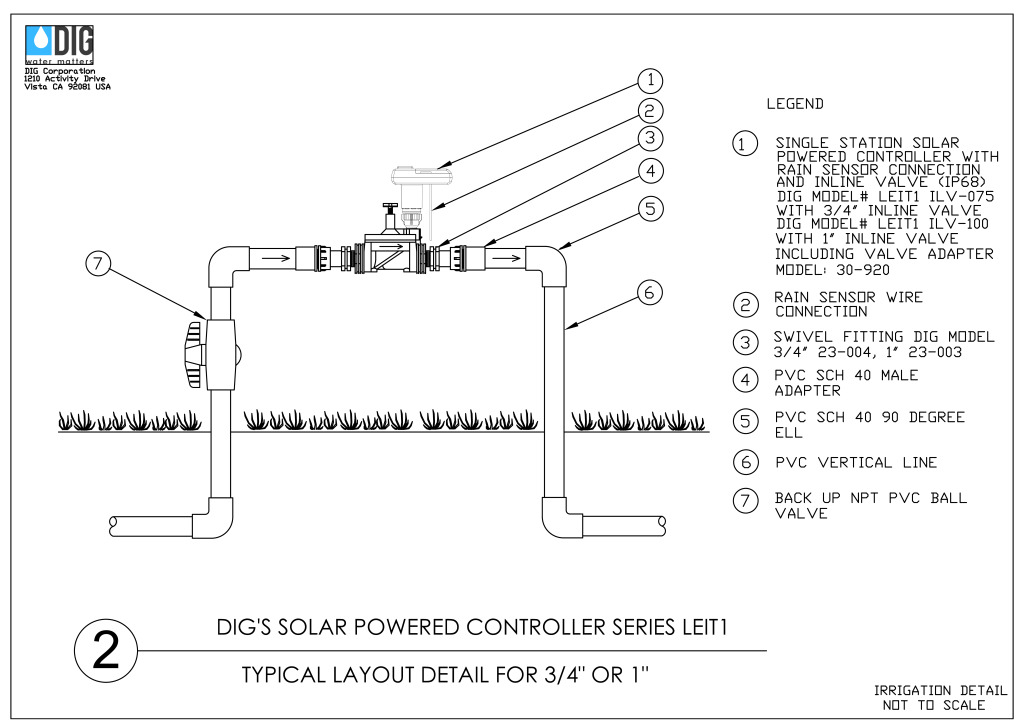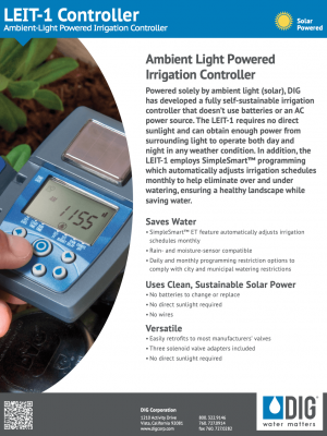 DIG’s LEIT 1™ ASV single-station solar powered controller with a two-wire DC latching solenoid is available on a 3/4″ or 1” heavy duty anti-siphon valve for use in residential and commercial applications. Powered by a photovoltaic module with a patented microelectronic energy management system, the LEIT 1™ requires no batteries or direct sunlight to operate, and it is used above grade in any location where there is light. Distinguished among the LEIT-1™ features are 20 preset monthly historical Evapotranspiration (ET) programs for spray heads and drip irrigation, with an editing feature that can be used as part of the controller programming.