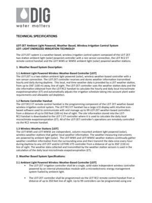 DIG’s LEIT-2ET wireless, solar powered and weather-based system utilizes evapotranspiration (ET) data and site information to monitor and adjust daily irrigation programming for each zone according to real-time weather information provided locally. The data transmitted from a local weather station hourly and daily, utilizing a radio frequency band, 915MHz NA, 866.5MHz Hong Kong and 868MHz International. Site information provided by the LEIT RC2 ET handset, combined with the weather station data are used by the controller to calculate the daily local micro climate and automatically adjust the daily irrigation schedule.