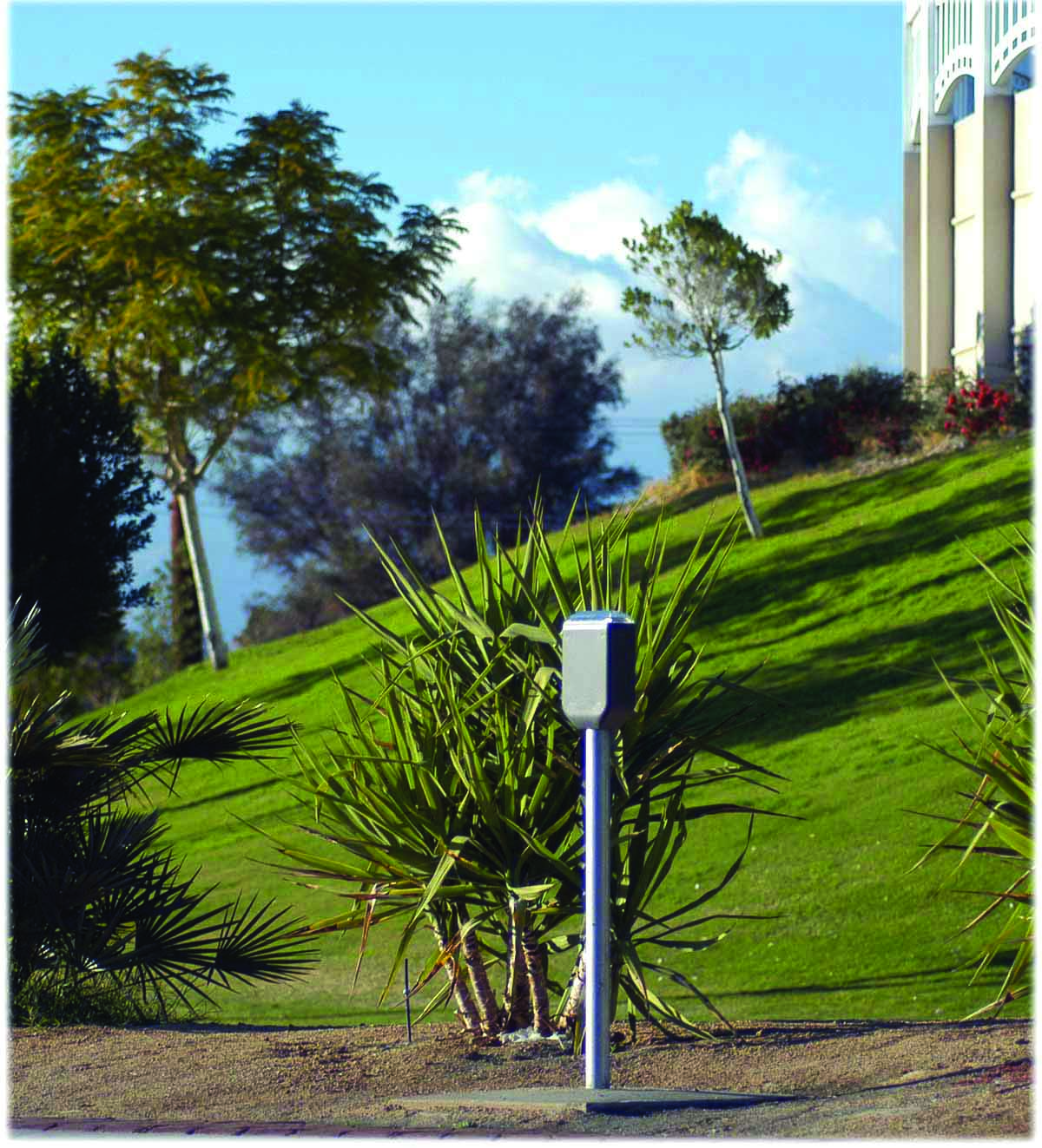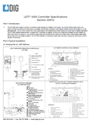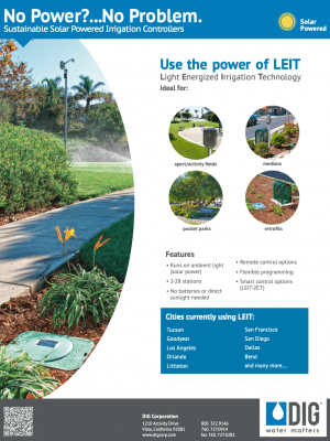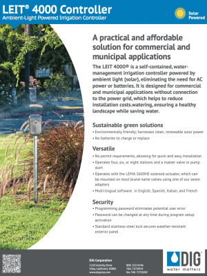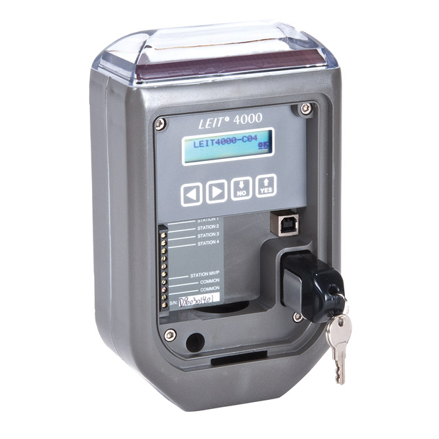 The LEIT 4000 is a self-contained, water management irrigation controller that harnesses ambient light (solar) as a power source. The controller’s easy-to-navigate features include four independent programs with three start times for each valve, password-protected entry, monthly budgeting up to 200 percent, rain stop up to 99 days with automatic restart, manual run via the program or valve, and status reports including current and past month’s information for each valve. A compact design and time-tested photovoltaic module harnesses ambient light energy to power the unit day and night in any kind of weather conditions.