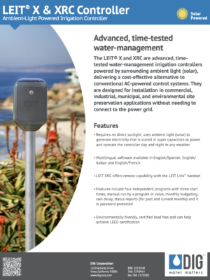 DIG’s LEIT X with 10 to 28 stations supports a permanent solution where there is no available AC power, utilizing only the power of ambient light (solar). The LEIT X is an advanced, ambient light (solar) powered, self-contained water management irrigation controller that provides a cost-effective solution for all type of irrigation applications.