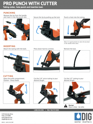 - Deluxe punch cuts 1/2″ polyethylene tubing and 1/4″ distribution tubing with cutter in handle
