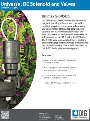 DIG’s S-305DC is an encapsulated, watertight, two-way magnetic latching solenoid that requires minimal power to operate. The S-305DC is used with DIG range of battery operated controllers, LEIT 2 ET system and others. With seven solenoid adapters available, the S-305DC can replace conventional solenoids on most valves, enabling DIG controllers to operate the majority of all brand name valves using DC power.