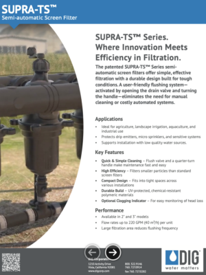 DIG Introduces the innovative and and patented SUPRA-TS™ semi-automatic screen filter series, for easy effective filtration. The plastic filters are designed for long life and service in hard conditions, utilizing a user-friendly flushing cycle by opening the drain valve and rotating the handle, eliminating the need for manual filter cleaning and expensive fully automated systems.